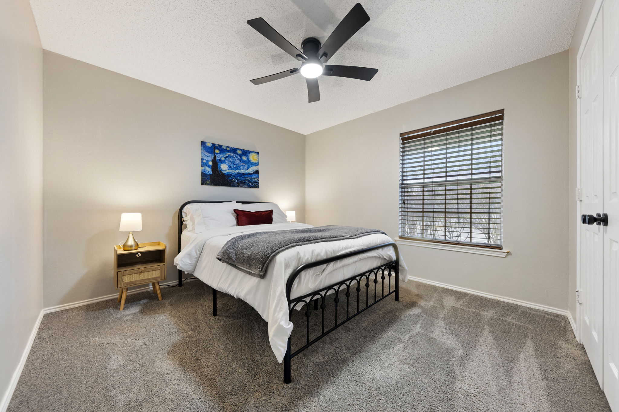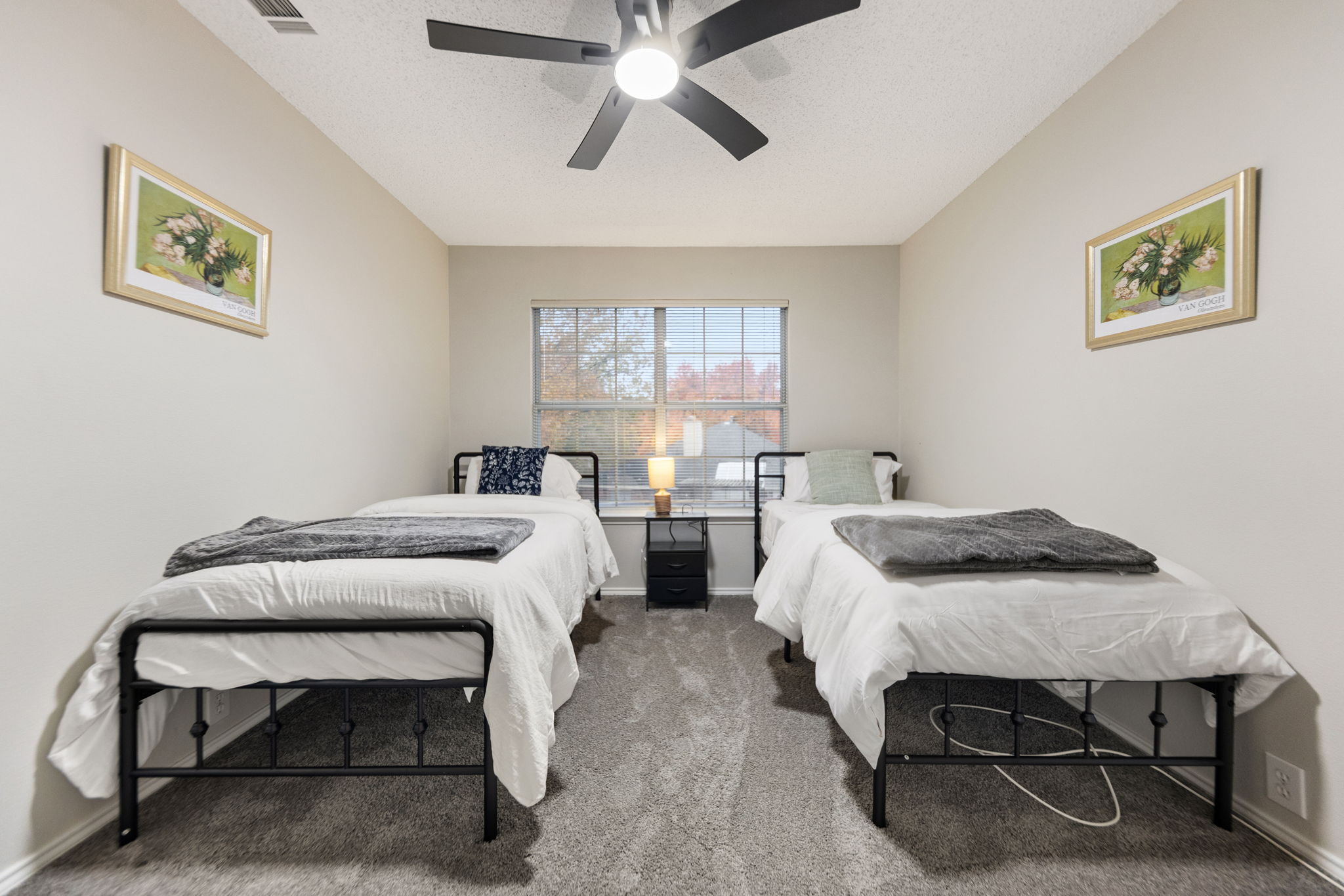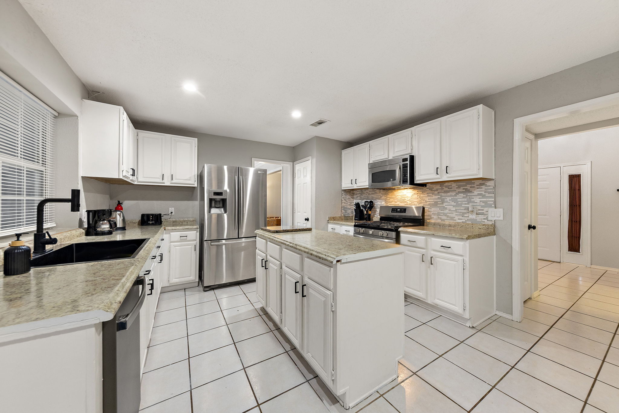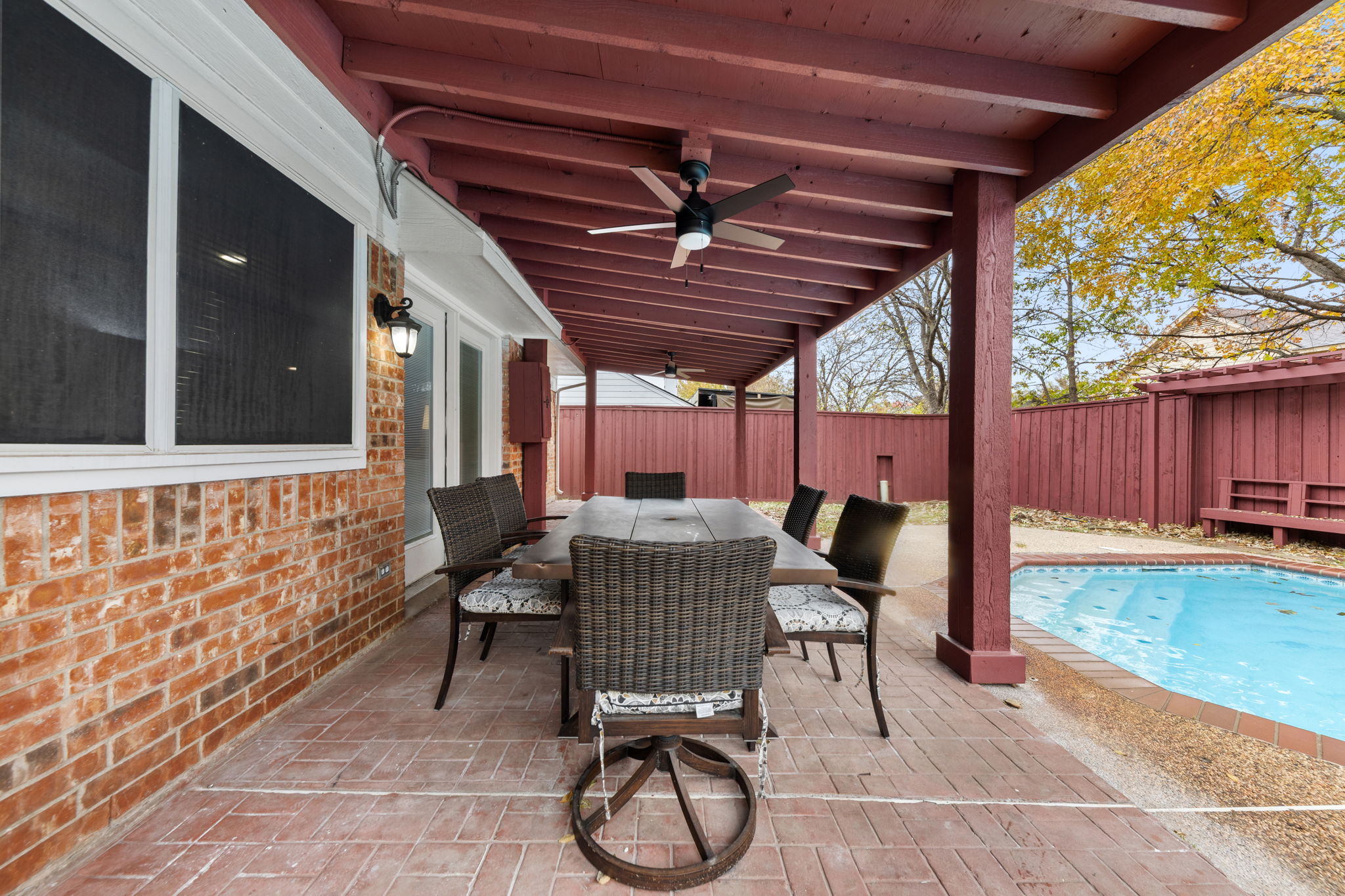 Outside, a fenced backyard with grass and an in-ground pool gives you a true escape after long days — morning laps, an afternoon float, or just sitting on the covered patio while the sun goes down. Central air, in-unit laundry, and an attached two-car garage keep the everyday details simple, so you can focus on your stay, not the logistics. 🧺🌤