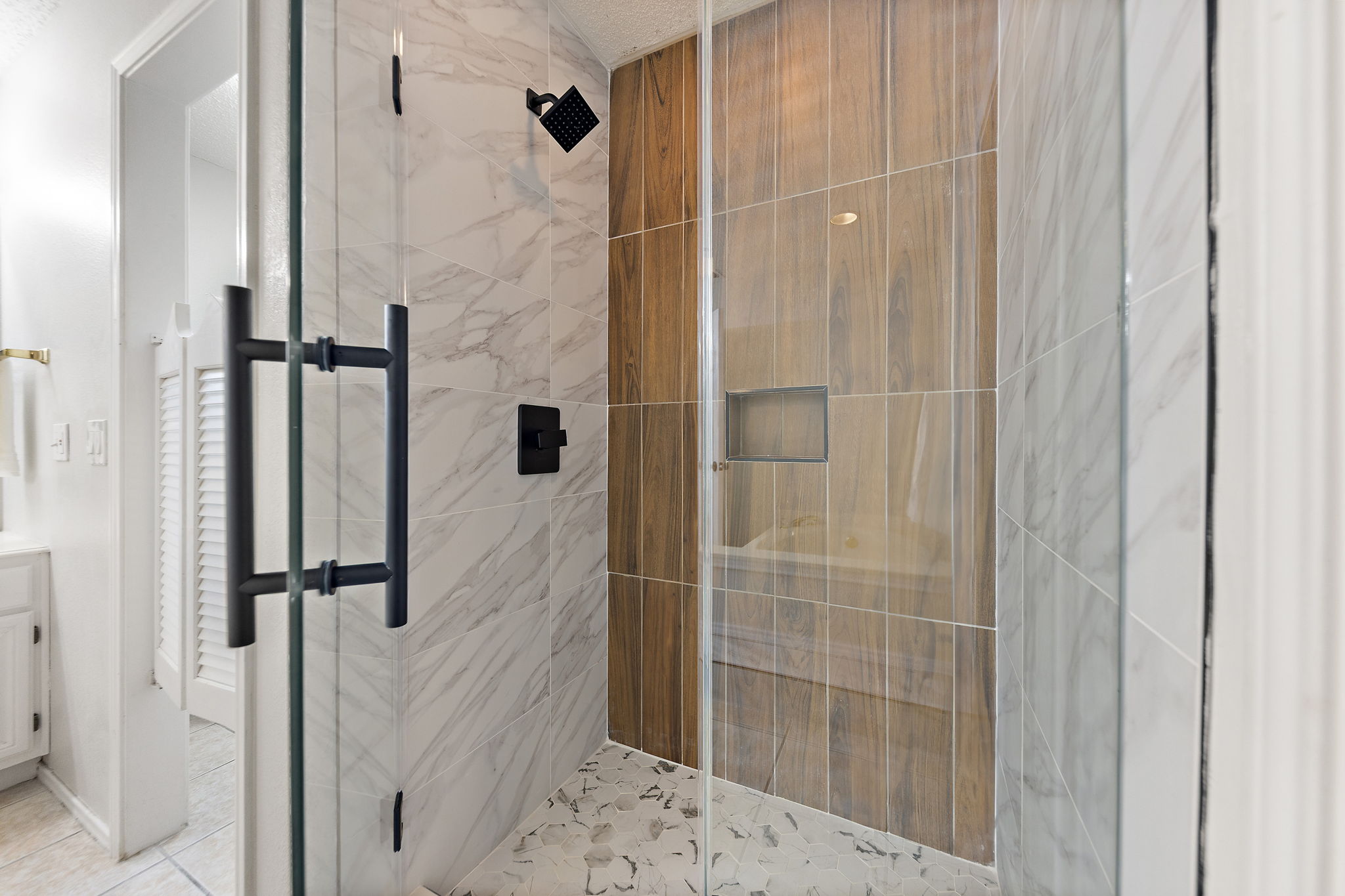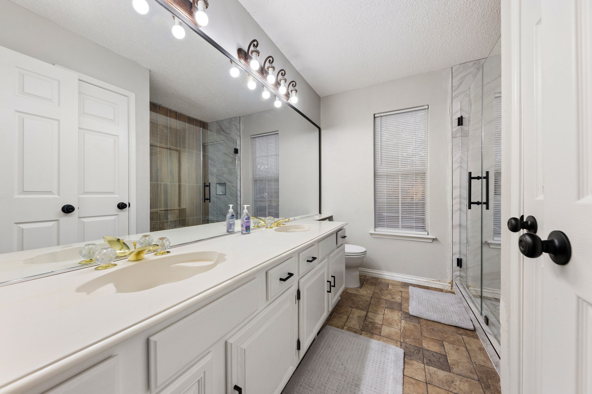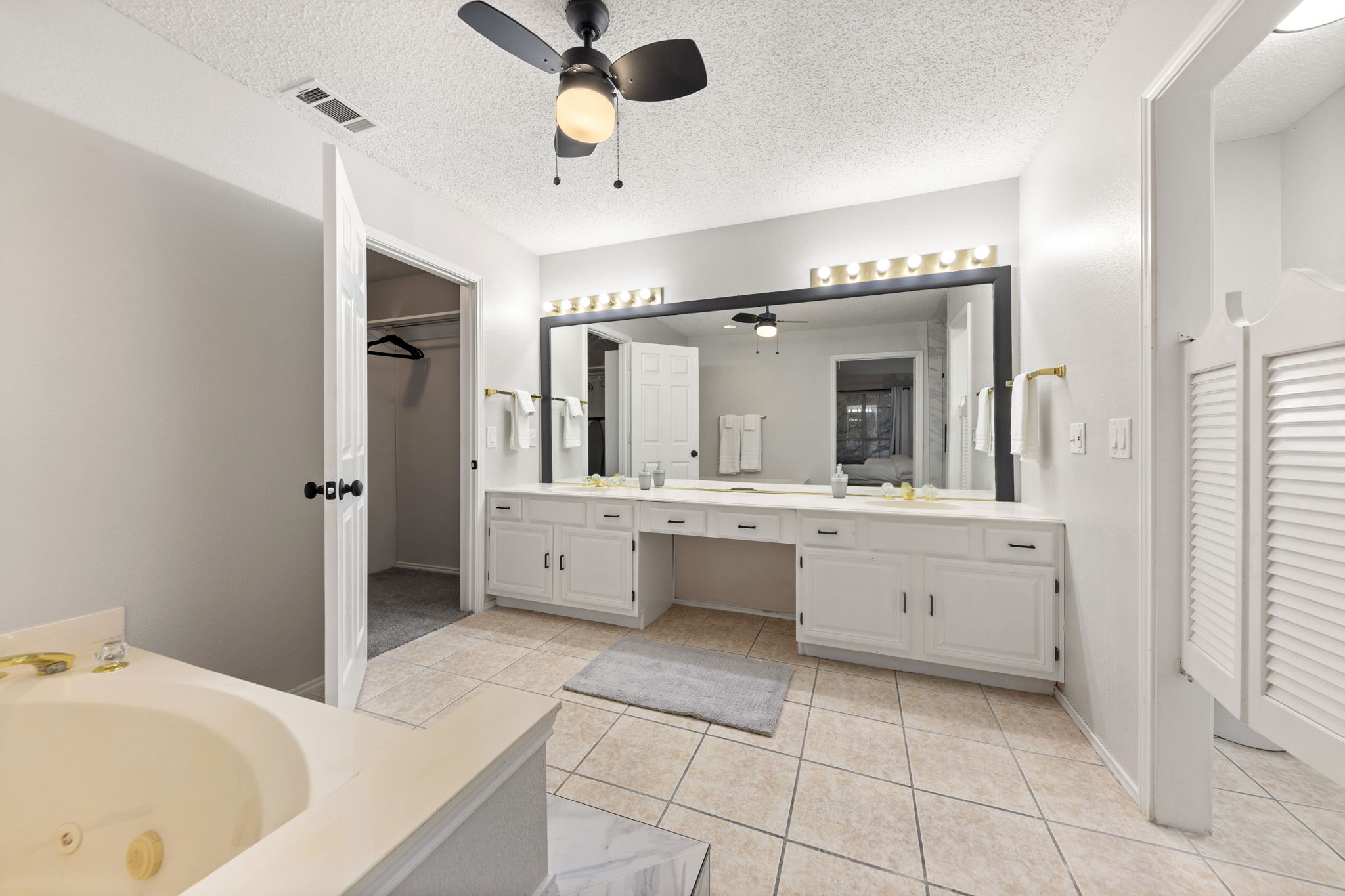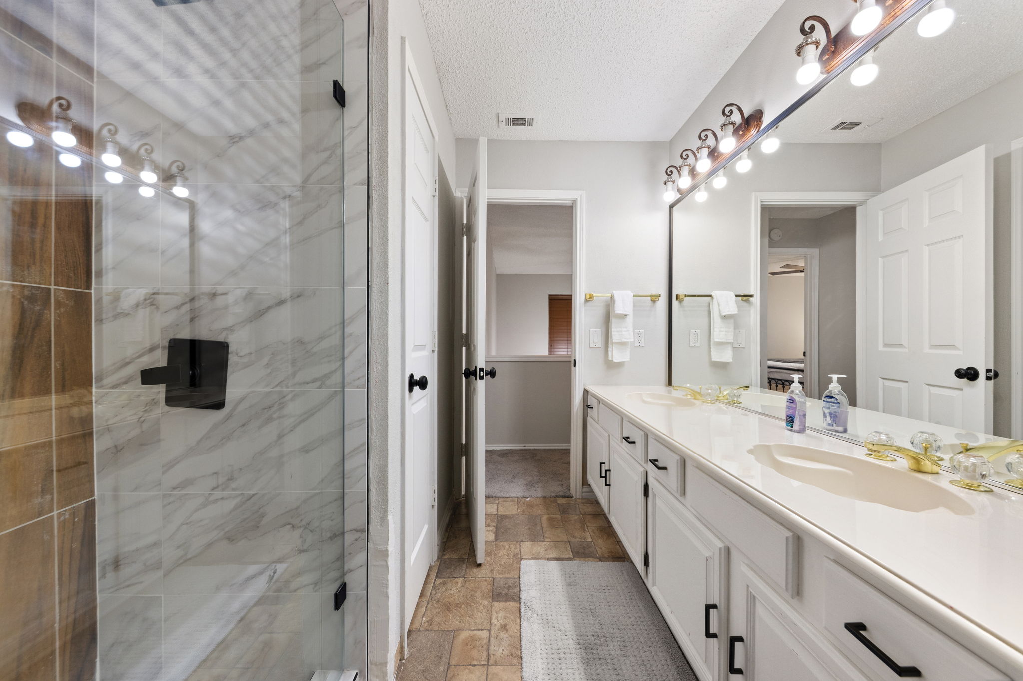 Upstairs, four bedrooms offer comfortable retreats, including a spacious primary suite with walk-in closet and bathroom with separate tub and shower — a place to soak, reset, and breathe at the end of the day. Hardwood, tile, and soft carpet underfoot keep the home feeling warm yet practical.
