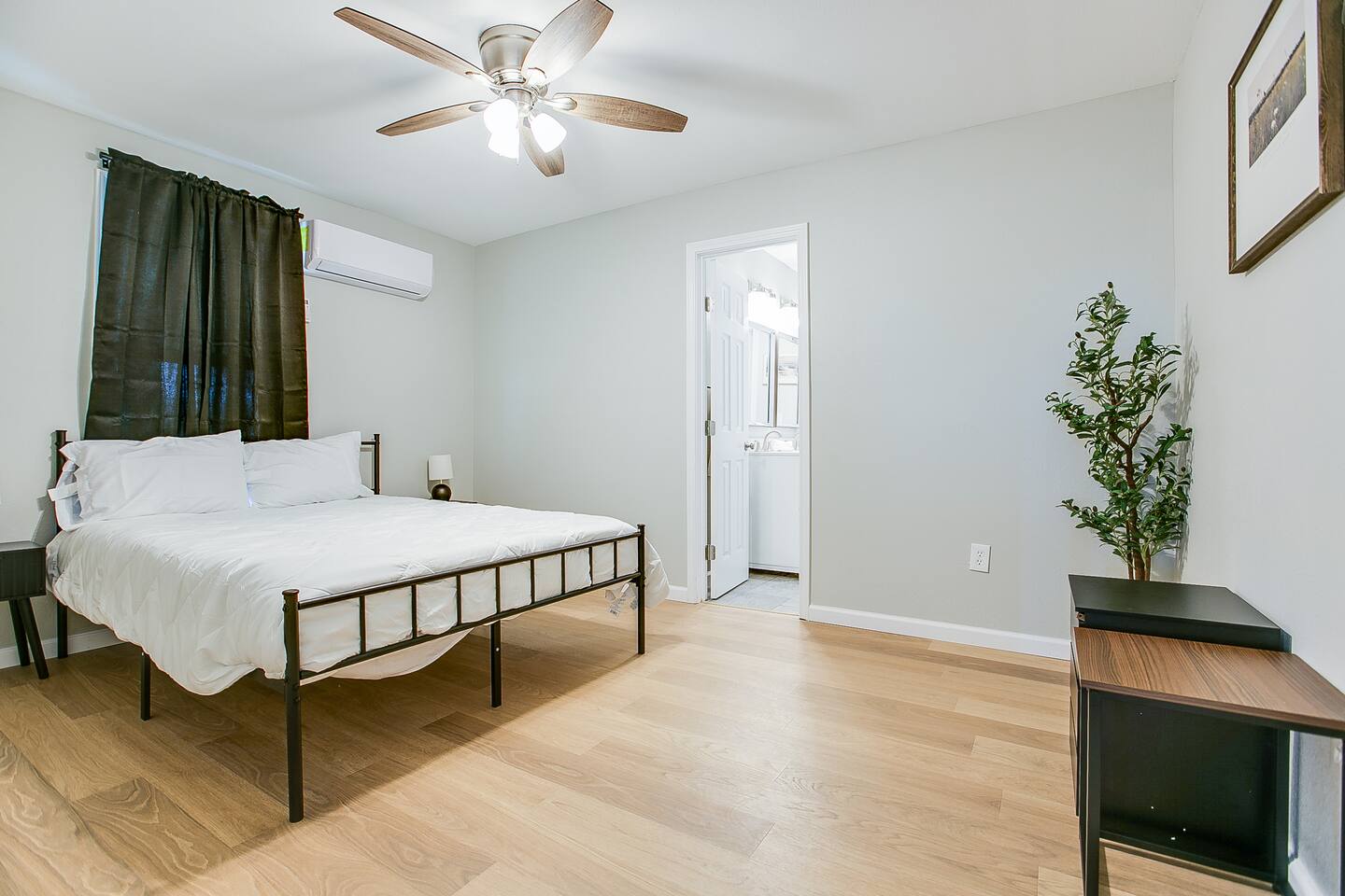 The bedroom features a cozy queen bed, soft linens, and a peaceful feel designed for restful nights 🛏️. Whether you’re staying a few days or a few weeks, the layout is practical, comfortable, and easy to live in.