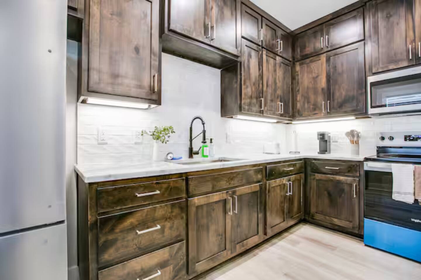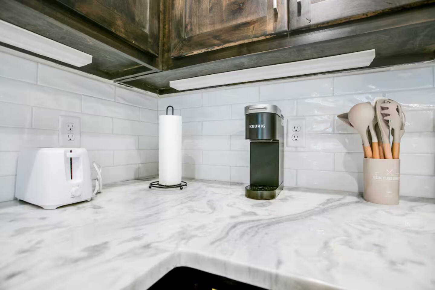 Fully equipped kitchen with stainless appliances, coffee maker, and all the essentials to cook at home