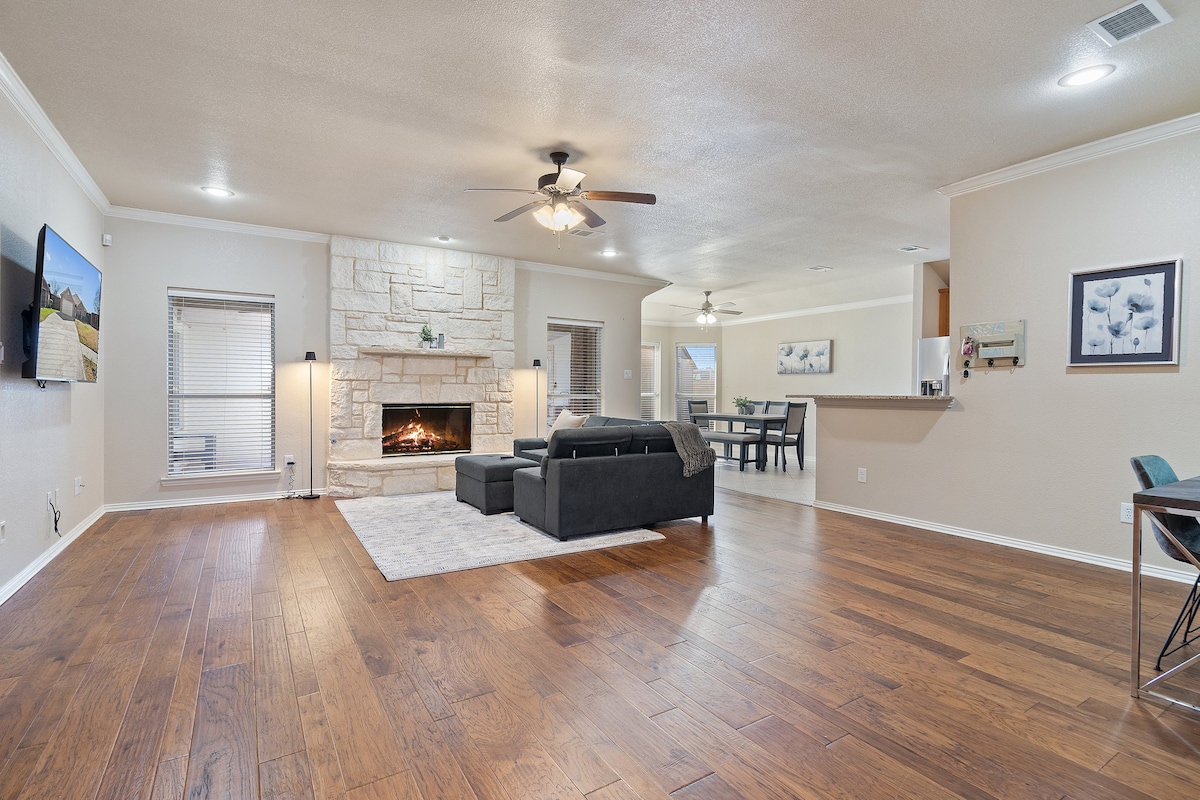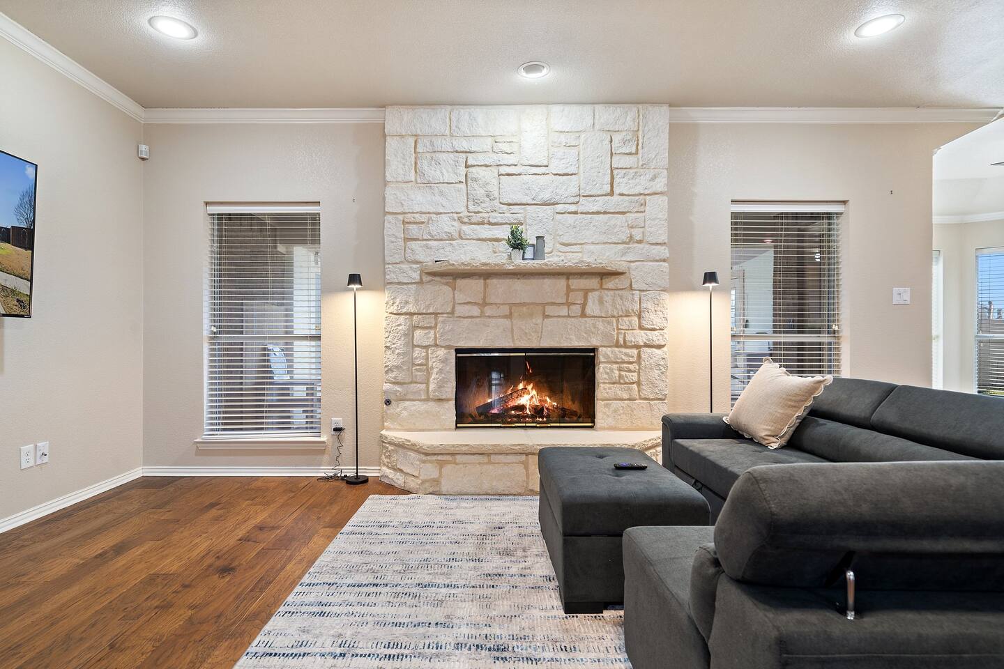 Unwind in the oversized living room with plush seating, a cozy fireplace, and a convertible sofa bed for extra guests. It’s perfect for movie nights or downtime after a busy day.