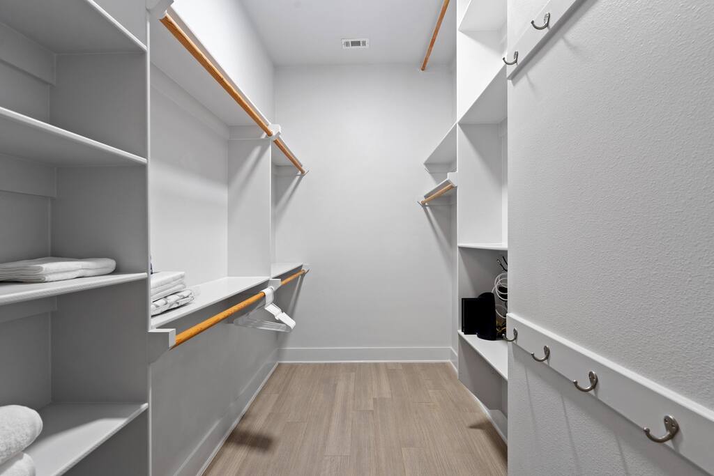 The spacious bedroom features a plush king-sized bed, inviting you to unwind after a long day of exploring. Natural light floods in through large windows, creating a warm and welcoming atmosphere. The room is also equipped with a roomy walk-in closet and a full-length mirror, providing ample storage space and an opportunity to admire your outfit before heading out.