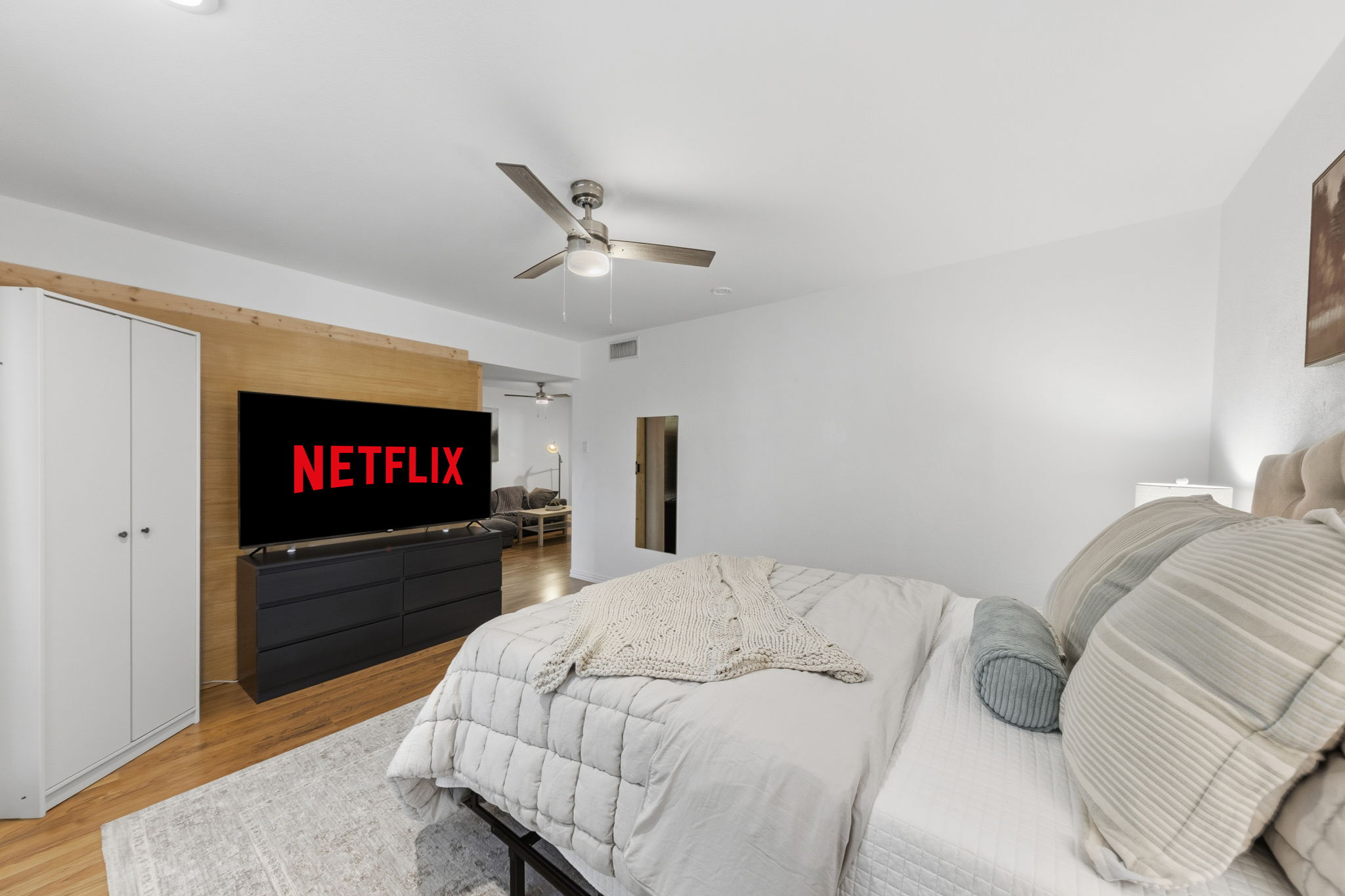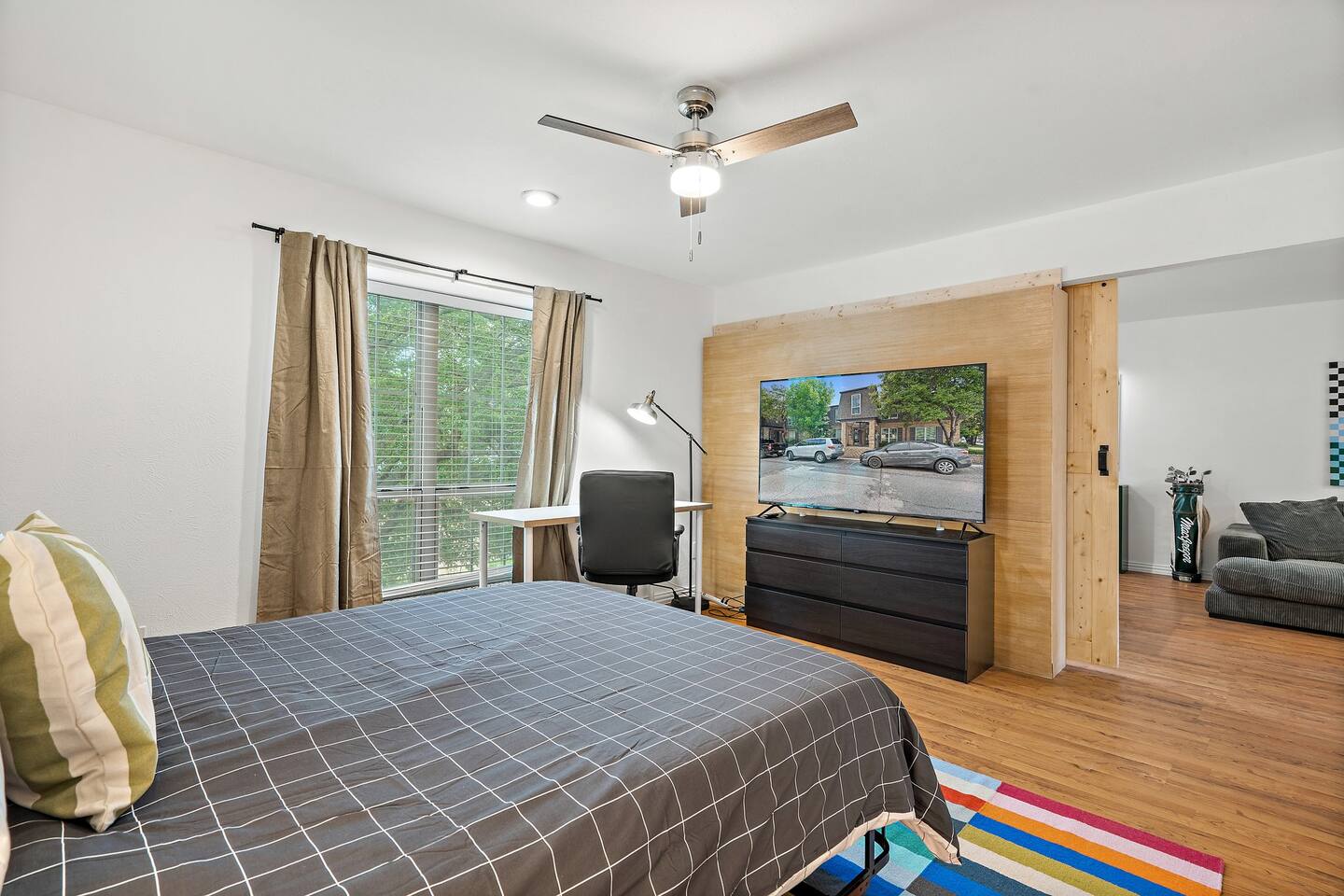 Bedroom 2: Serene workspace with 65″ Roku TV, desk, office chair, and stylish barn door