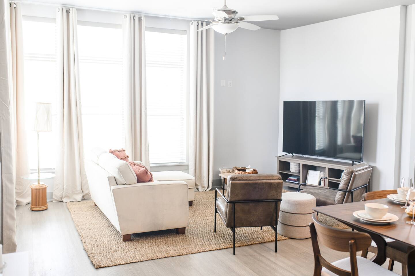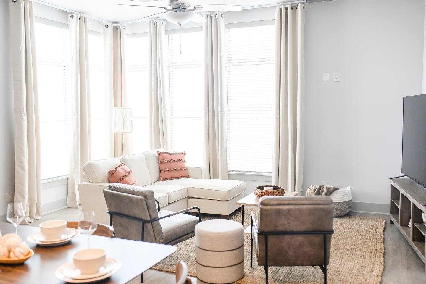 Stretch out on the soft sofa and catch up on your favorite series with the oversized smart TV. Natural light and clean lines create a calm, contemporary atmosphere.