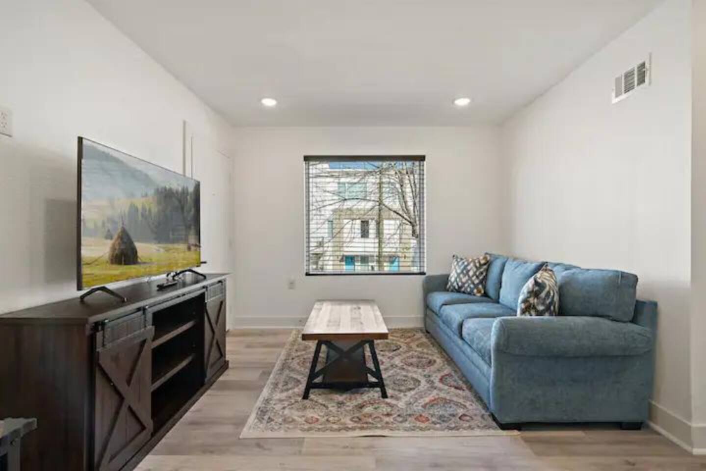The living area is relaxed and cozy, with a sofa that folds into a confrontable bed, coffee table, flat-screen TV.