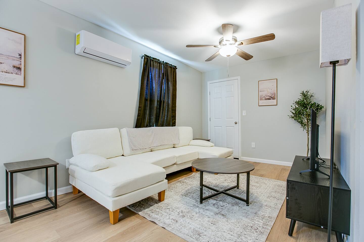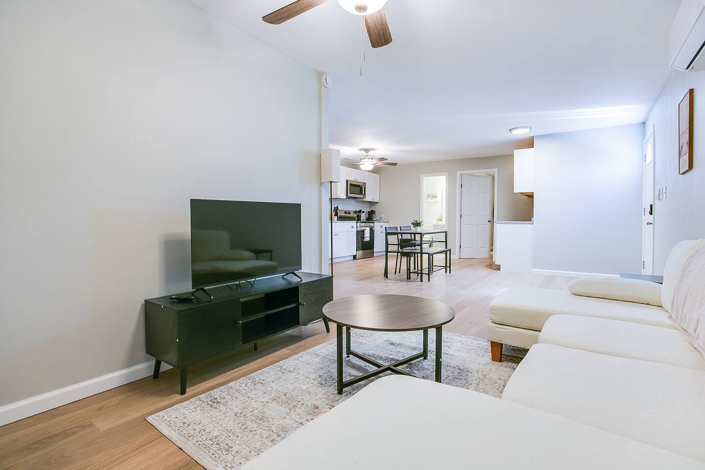 The open living area is perfect for relaxing after a day out — stream a movie on the smart TV, catch up on work with the fast Wi-Fi, or simply unwind in the comfortable seating area.